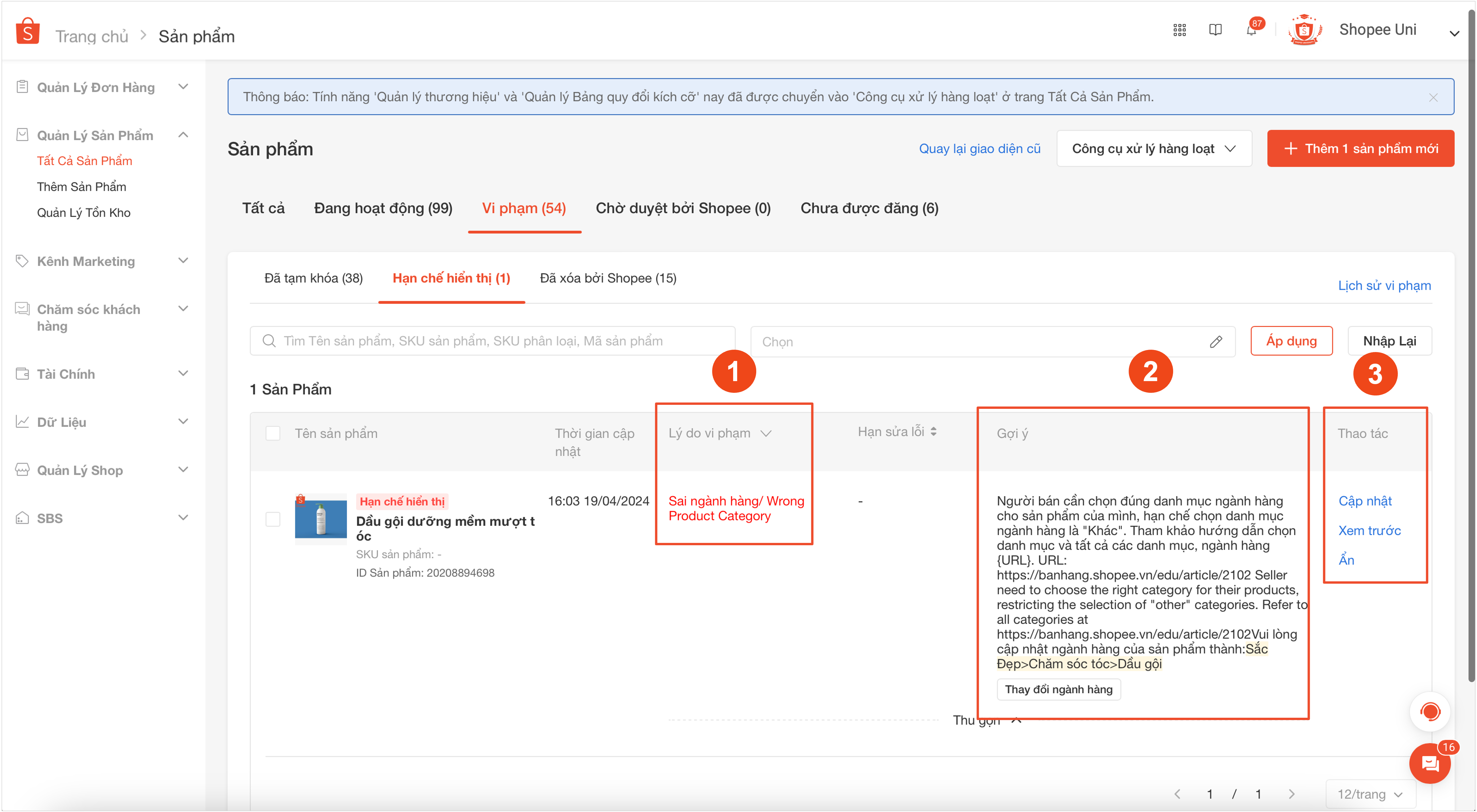 1. Khi sản phẩm bị hạn chế hiển thị do sai Ngành hàng, một thông báo sẽ hiển thị trong tab Tất cả trang Tất cả sản phẩm (trên Kênh Người Bán) và Người bán cũng sẽ nhận được thông báo qua Thông báo đẩy (trên điện thoại) và email.