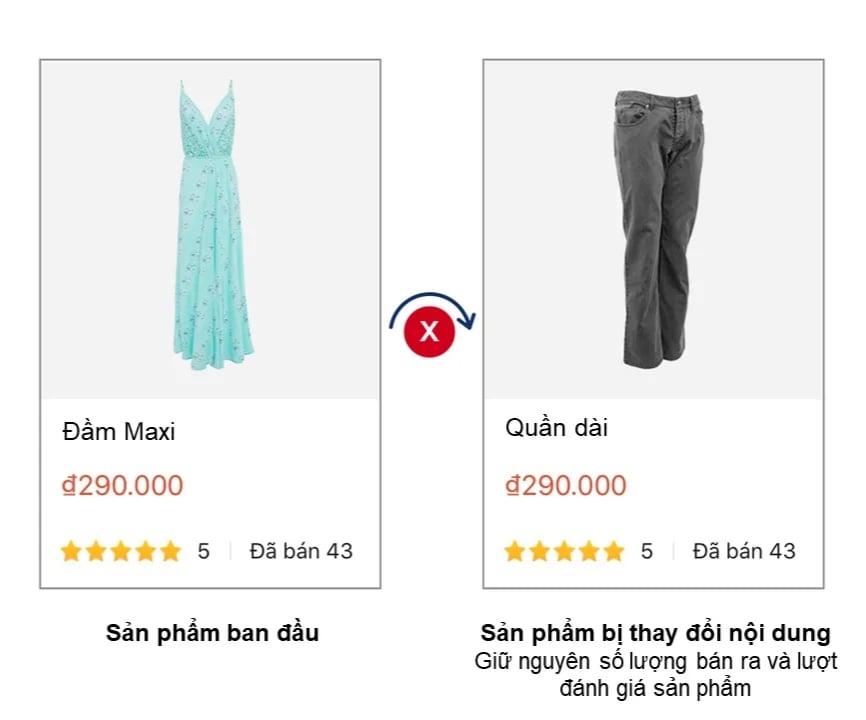 Chi tiết: Hành động chỉnh sửa thông tin sản phẩm ban đầu thành một sản phẩm khác để gian lận đánh giá.